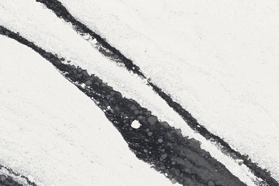 A white background is intersected with bold, translucent black and charcoal veins with muted light gray spatters and cross veins dispersed throughout.