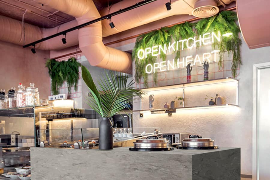 The light gray hue and monochromatic movement of CorianĀ® Solid Surface Ash Aggregate is enhanced with scattered particles that create a robust visual presence.