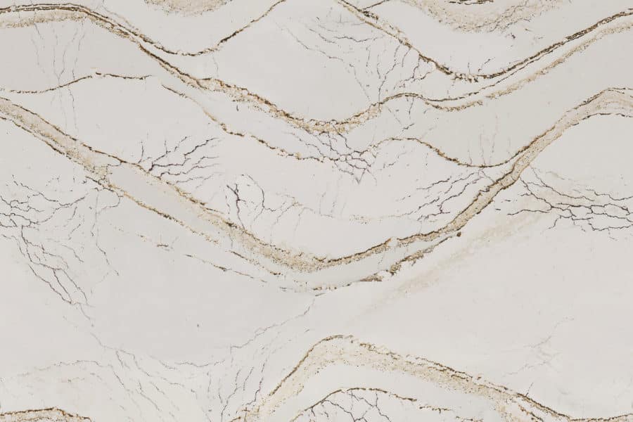 Graceful and flowing, Clovelly displays a creamy background with copper and brown swooping veins and white, lightning-like veins that rise and fall across a surface interspersed with delicately latticed threads and black accents.