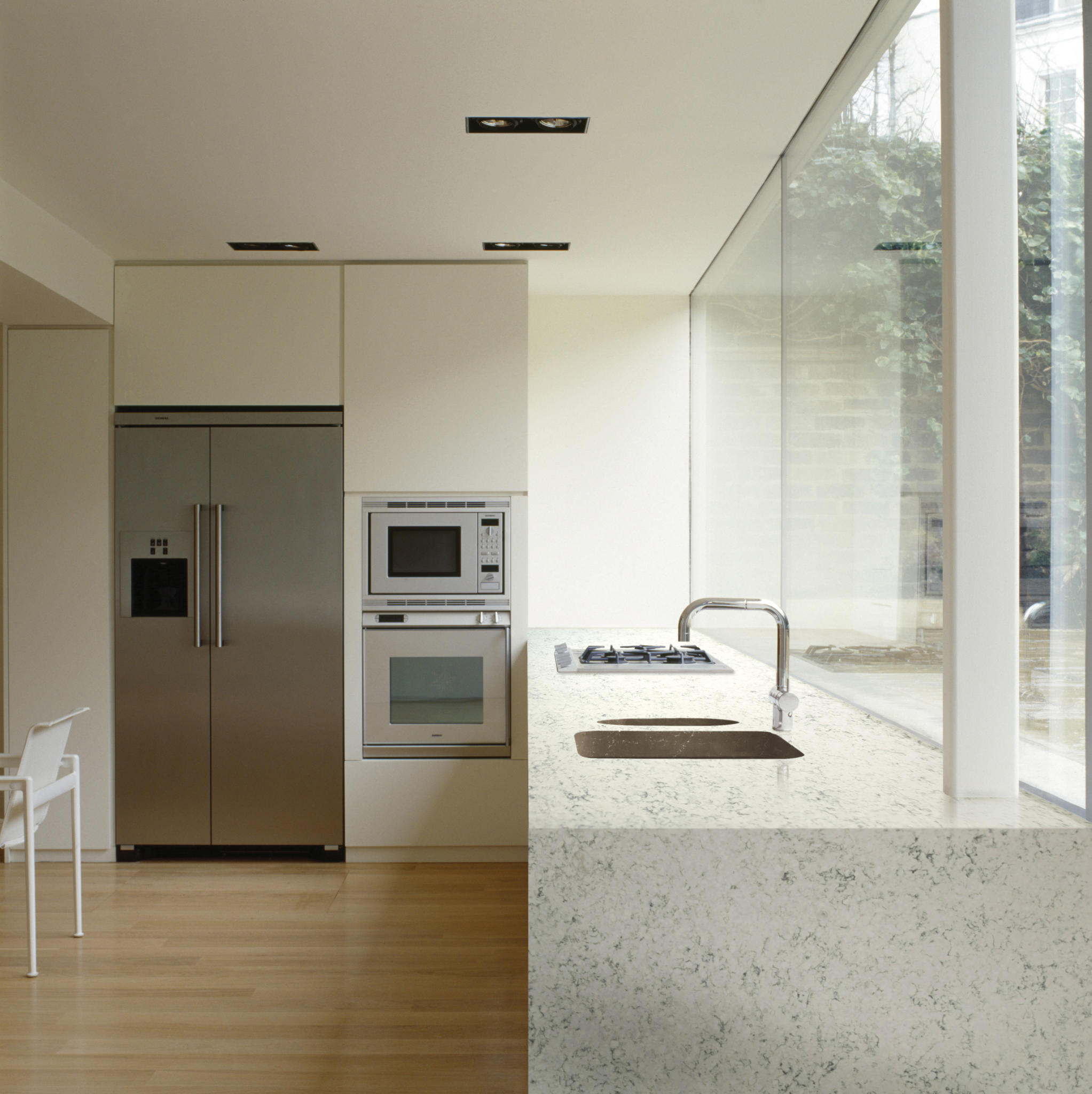 Subtle grey veins on a creamy pearl background provide a sophisticated surface that is both classic and contemporary.