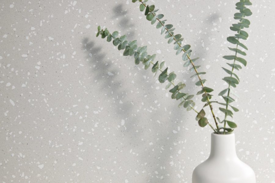Like wet sand on a shell-dotted shoreline, this intriguing design is made from recycled Cambria and features a pearl-gray base with close-knit sprinklings of light and warm specks, intermittent black dots, and a mingling of pale white silhouettes.