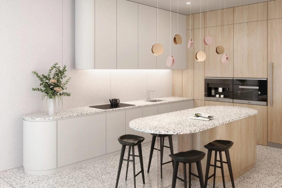 Like wet sand on a shell-dotted shoreline, this intriguing design is made from recycled Cambria and features a pearl-gray base with close-knit sprinklings of light and warm specks, intermittent black dots, and a mingling of pale white silhouettes.