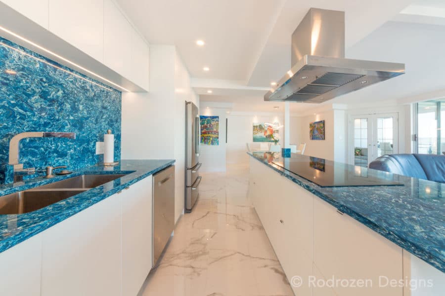 Vibrant blue, green and gray dance with white veins. Twisting and turning in an intense, multi-dimensional pattern to create an unprecedented, dynamic design reflective of nature and abstract art. Photo: Rodrozen Designs
