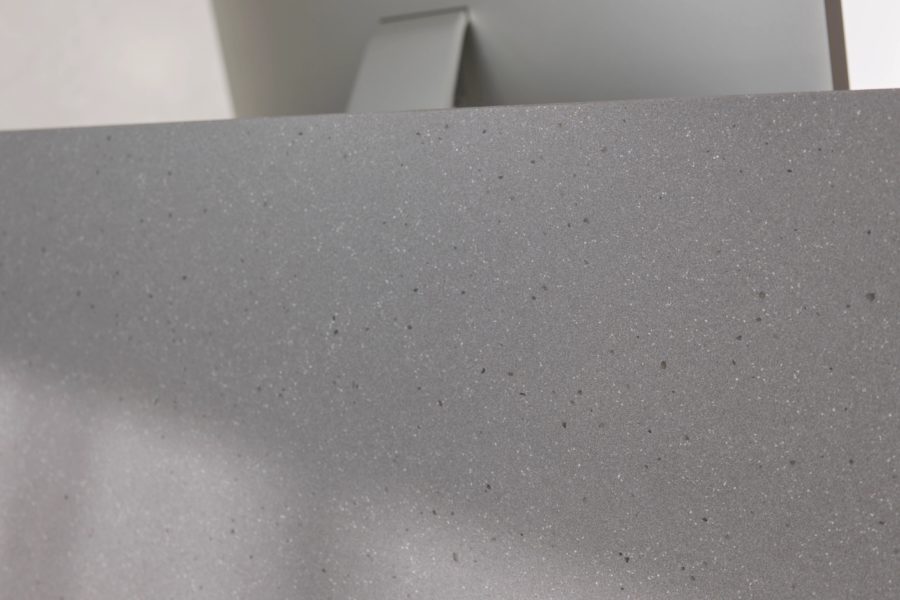 Gatherings of white specks intermixed with particles of black and medium gray rest on an industrial-gray backdrop that takes its inspiration from the soaring skyscrapers of the Windy City.
