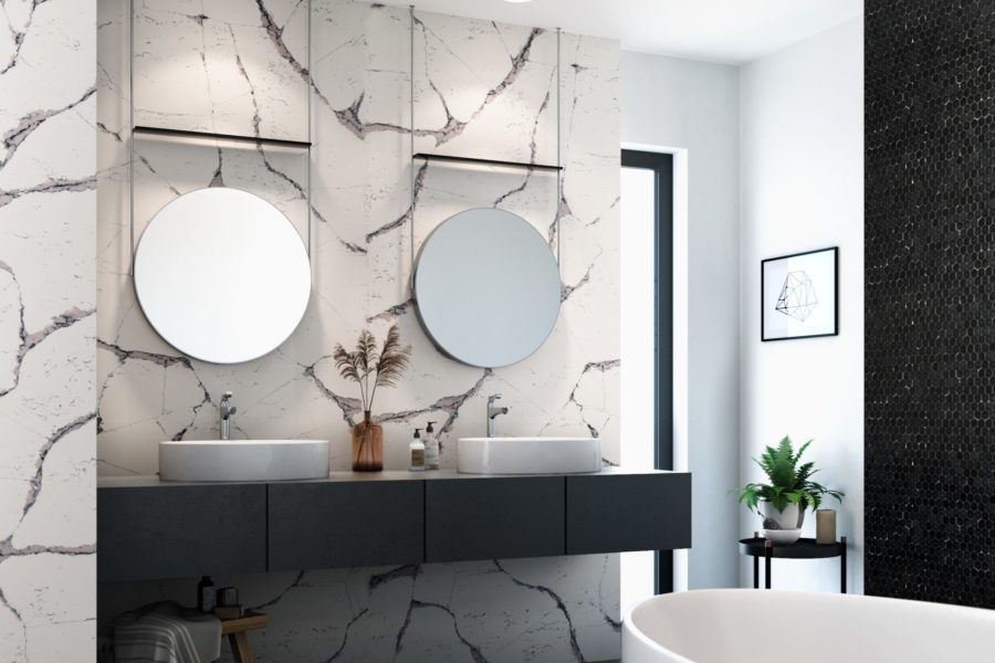 Harrogate offers a pale creamy base accentuated with black and dark greige veins, dark clusters, and delicate gray filaments that form geometric sections.