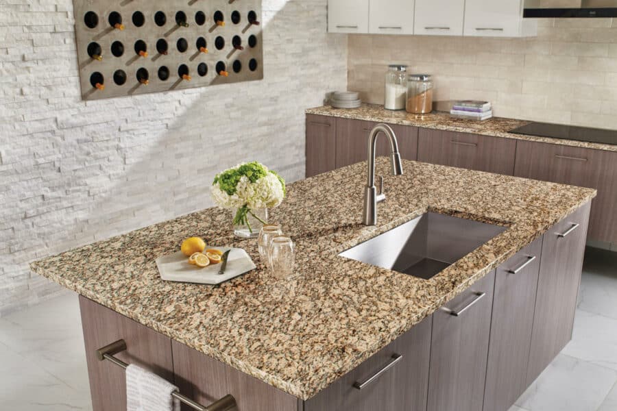 Santa Cecelia granite from Brazil is a beautiful beige background with burgundy, gold and dark gray veins. This durable polished slab granite is recommended for all indoor and outdoor projects including walls, countertops, landscape features, and flooring.